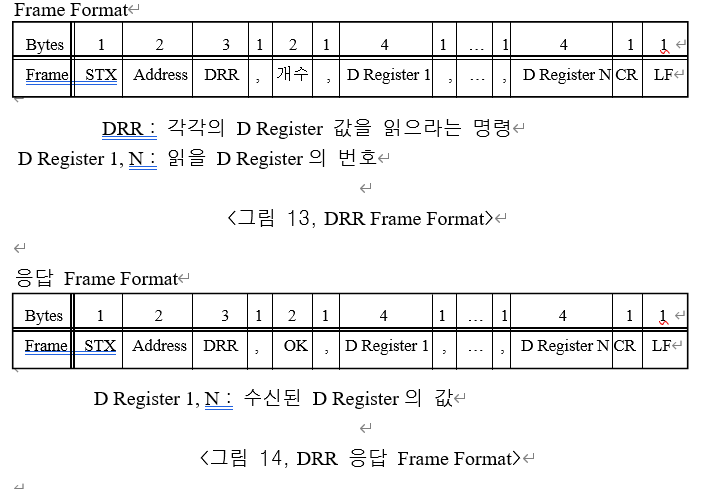 DRS Command는 연속되는 D Register값을 Read할 수 있는 Command로, Frame상에서는 Read하고자 하는 개수와 시작 D Register의 번호를 설정한다.