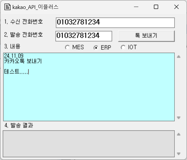 수신번호와 발신번호 그리고 구분 및 내용을 입력하고 톡 보내기 버튼을 누르면 톡을 보내는 소스입니다.