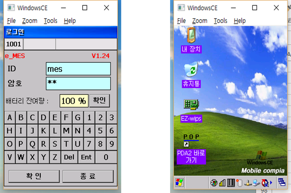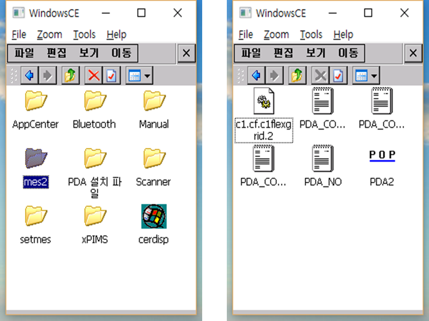 # Flash DISK 의 MES2 디렉토리의 POP(PDA2)를 실행 (무선연결 상태 및 바코드 스캔 가능 여부 확인)