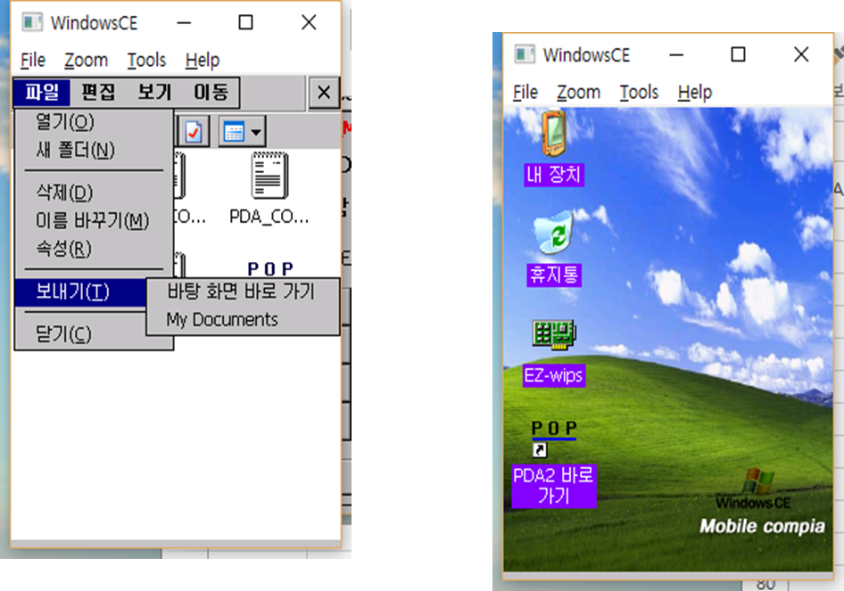 # POP(PDA2)를 선택하고 파일에서 보내기-바탕화면바로가기를 누르면 바탕화면에 표시됨