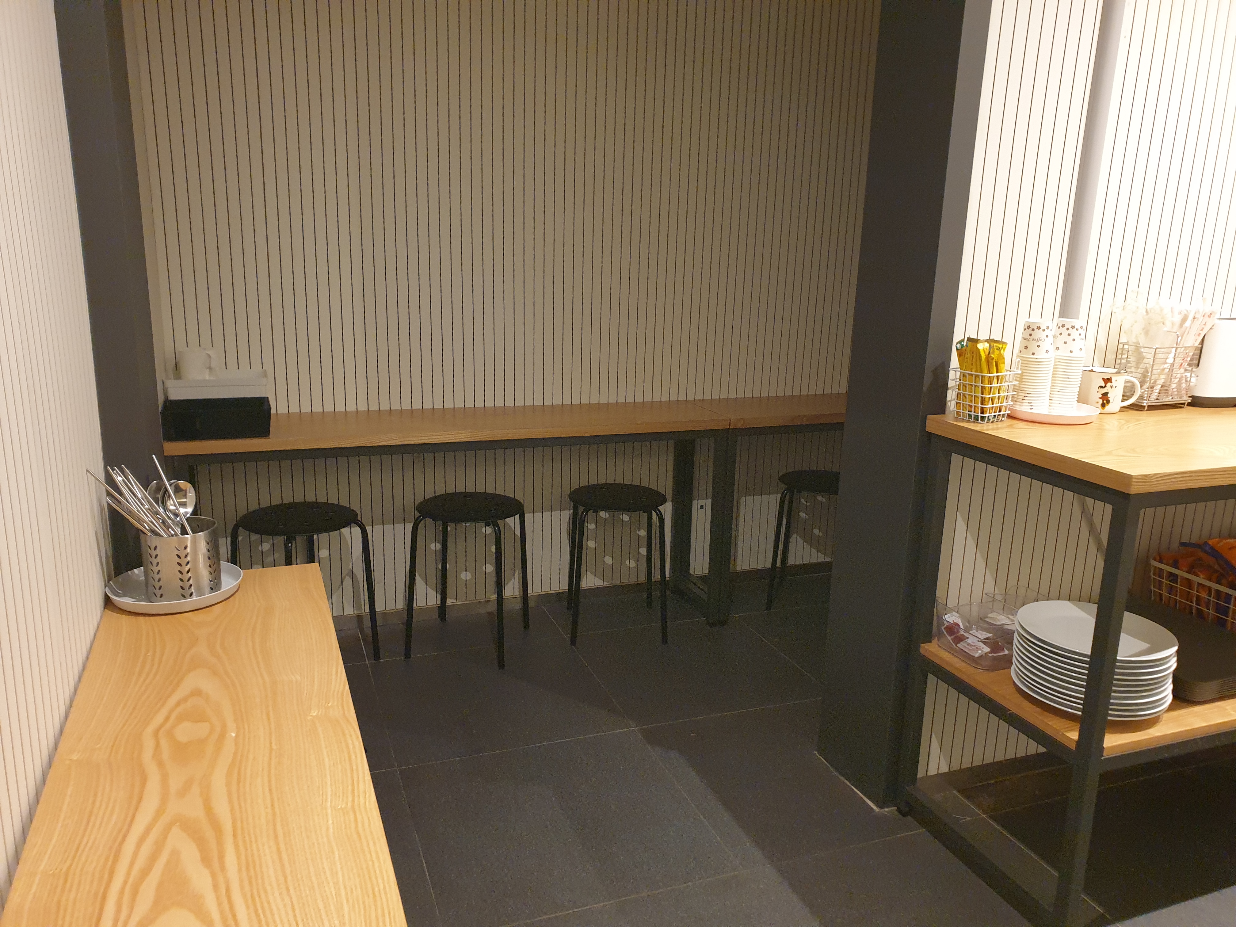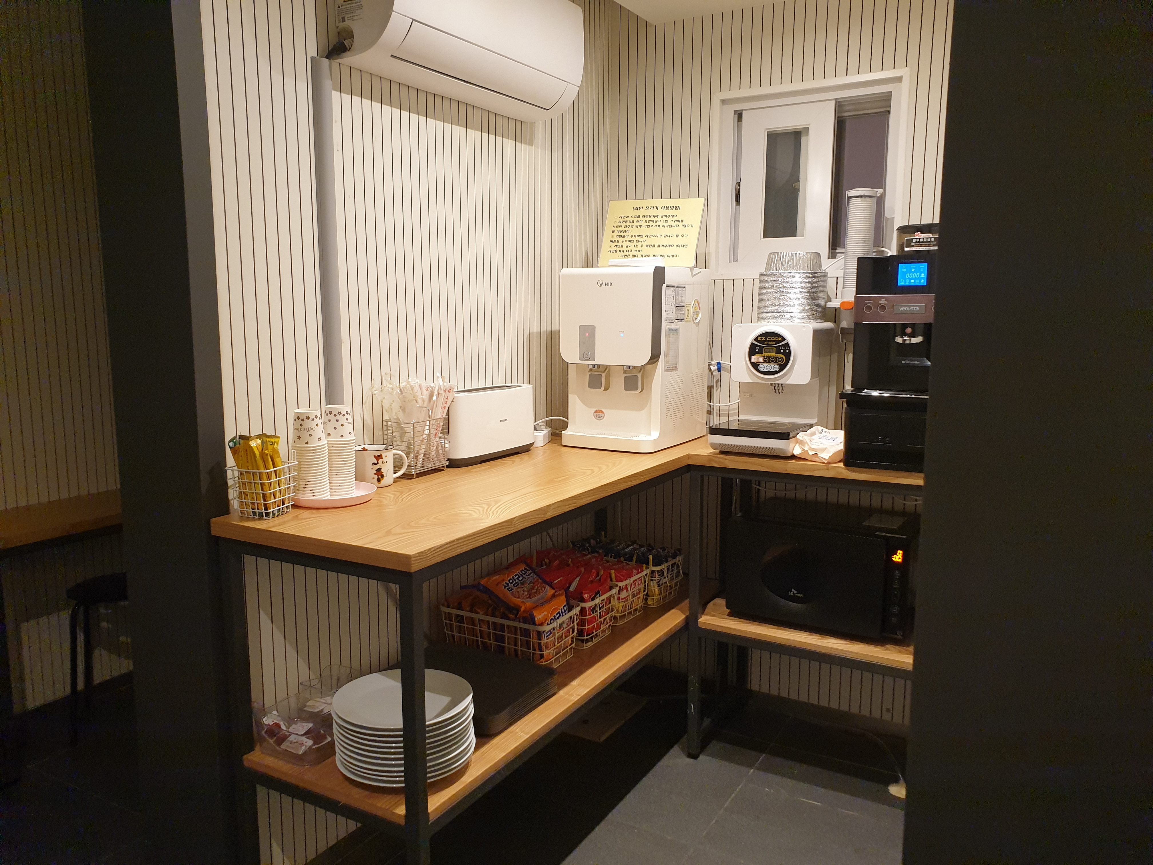 야식으로 라면 등을 제공하고 평일은 아침에 간단한 식사 준비